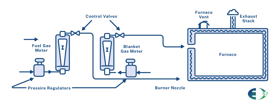 The fuel gas flow and blanket gas(es) flow, when required, are set and controlled manually by the operator using the pressure regulators and control valves. Since most furnaces operate at atmospheric pressure, gas flows are nearly always near a pressure of 14.7 psia. It is necessary to supply a meter that has a low pressure drop and a “minimum PSIA” of under 14.7 psia.